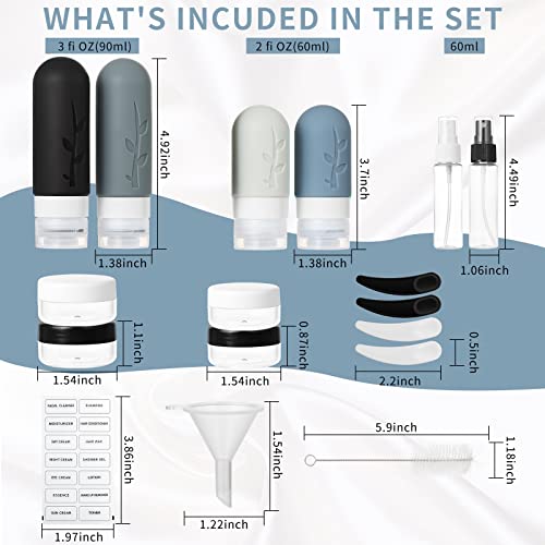 ✈️【Designed for Travel accessories】Our 18pack reusable travel bottles set with 1 waterproof bag, 2 pcs silicone bottles (3oz/90ml), 2 pcs silicone bottles(2oz/60ml), 2 pcs spray bottles(1.05oz/30ml), 4 pcs cream jars(0.35oz/10ml), 1pcs funnels, labels, brush and 2 pcs spatula!Different accessories for your different needs