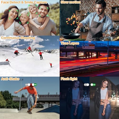 Time-lapse ,Slow motion, Continuous shooting ,Anti-shake ,Smile & Face detection, Beauty face, Selfie, Flash Light(ON/OFF) , Self-timer(2S/5S/10S) , Beauty FaceApplicable Users : camera for teens boys, camera for teens girls, digital camera for starters, digital camera for seniors, digital camera for students, digital camera for travelers(Compact and easy to carry around ,Indoor & Outdoor), and so on.Does This 4K Camera Have the Ability to Take B&W Pics? : YES. You can take regular pictures as well as black and white, red, green, blue, and other fun filters you can choose (which you think is fun for whatever reason).How to Upload the Pictures/Videos to my Computer? : Please connect the USB cable to your computer, you will find the camera’s files on your computer, and then you can transfer the pictures/videos to your phones.What kind of tripod is it suitable for? : There is a Standard 1/4 Inch Tripod Mount Screw at the bottom of this digital camera.