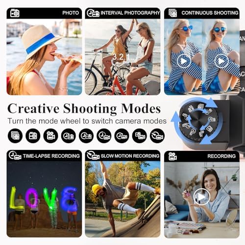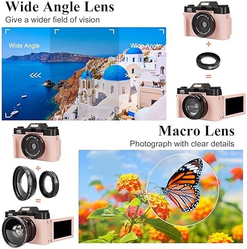 【Digital Camera with Wide Angle Lens & Macro Lens】This digital camera is equipped the camera with a professional detachable wide angle lens with a macro lens, so the camera is great for capturing wide horizons easily, and macro lenses capture the diversity of the tiny world. Sharp 4K photos can be ruled out with manual focus. With a knob on the top of the camera, you can switch between photos, video, time-lapse photography, and other features.
