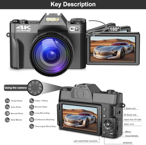 📸【Digital Camera with Wide Angle Lens & Macro Lens】This digital camera equipped the camera with a professional detachable 52mm wide angle lens with macro lens, so the camera is great for capturing wide horizons easily, and macro lenses capture the diversity of the tiny world. Sharp 4K photos can be ruled out with manual focus. With a knob on the top of the camera, you can switch between photos, video, time-lapse photography and other features.