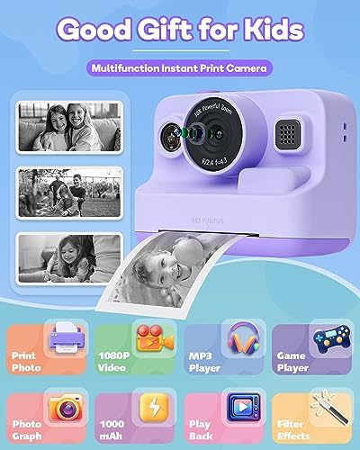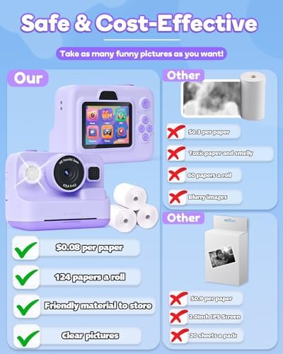 📷【Safe & Durable】Kids instant camera is printed with advanced thermal printing technology, the printing paper does not contain BPA, which is safer and more assured. High-quality soft plastic shockproof shell provides effective protection against drops. Safe and reliable toys are the most suitable gifts for children.