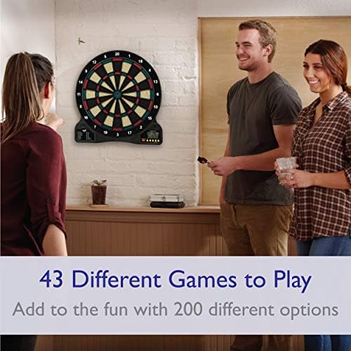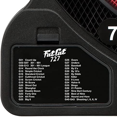 The Fat Cat 727 electronic dartboard features 18 games with 96 different options. Includes 6 soft tip darts. The Fat Cat 727 has a 13″ target face, and a missed darts catch ring. Requires 3 AA batteries to operate, which is not included. Measures 22-1/2″ L x 19-1/2″ W x 1-1/2″ D.