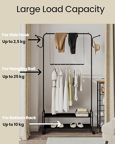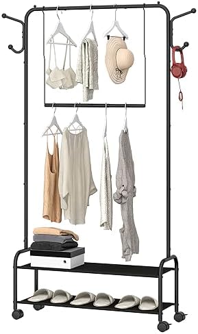 Thoughtful Details: The 4 side hooks are specially designed for your keys, umbrella, or bags, providing convenient storage options. The anti-slip bead design on each side prevent clothes hanger from falling down. The 4 wheels provided with this clothes racks help you to move from here to there. Every design detail has been carefully thought through to create a practical storage rack for you
