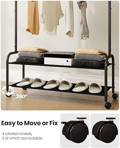 Moving or in Position: Easily move the garment rack to different rooms with the 4 swivel wheels. Lock 2 wheels in place for added stability and keep the rack stationary