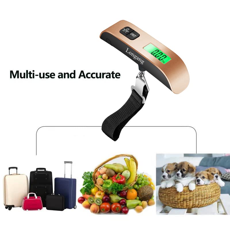 Manufacturer Longang Item Dimensions 5.1 x 1.2 x 2.4 inches Item Weight 3.17 ounces Battery Specifications Maxell CR2032 Color Gold Maximum Capacity 110 Lbs/50KG Packing List Digital Luggage Scale x 1, Maxell CR2032 Battery x 1, User Manual x 1 Screen Display LCD with Green Backlit Recommended Uses For Product Luggage, Package, Travel Bags, Suitcases, Fishing, Vegetables, Fruits, Pets, etc.