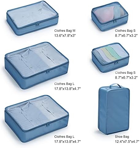 2 Large Packing Cubes: 17.8″ x 13.8″ x 4.7″1 Medium Packing Cubes: 13.6″ x 7.8″ x 3″2 Small Packing Cubes: 8.7″ x 6.7″ x 3.2″1 Shoe Bag: 12.4″ x 7.5″ x 4.7″