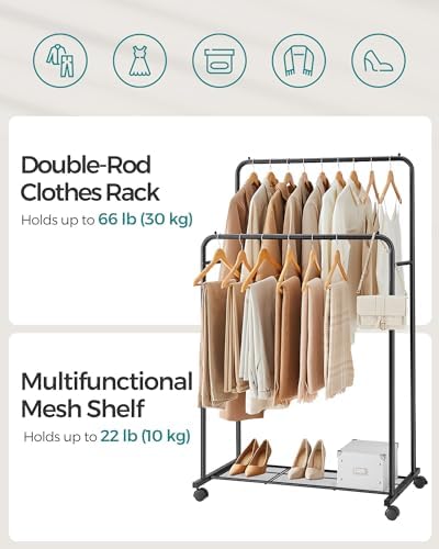 [What You Get] A double-rod clothes rack with wheels, a mesh shelf for shoes, 2 stoppers on the ends of each top rod to protect clothes from sliding off, and a simple way to restore order to your closet in no time!