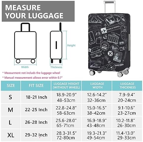 size and color: 4 sizes available to fit almost any luggage. SIZE S: fit 18-21 inch luggage; SIZE M: fit 22-25 inch luggage; SIZE L: fit 26-28 inch luggage; SIZE XL: fit 29-32 inch luggage .We have many kinds of colors, you can choose the one you like .The colorful cover also helps you find your luggage quickly.