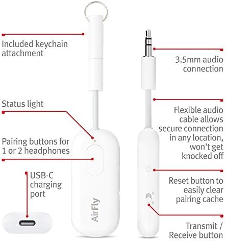 Tech Specs – Bluetooth 5.0, Audio Codecs: aptX Low Latency, aptX and SBC audio. Battery Life: 25+ hours Included – AirFly Pro, USB-C charging cable, travel pouch, keychain holder, quick start guide, manual