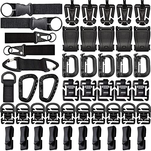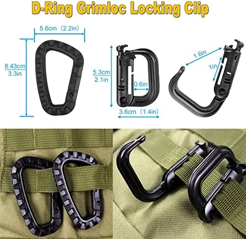 【48 PIECES OF MOLLE ACCESSORIES KIT】 The package includes 10 tactical 360-degree rotation MOLLE clips, 10 webbing ending clips, 5 MOLLE D-ring Grimloc locking clips, 5 web Dominator elastic strings, 5 strap management tool buckles, 5 tactical hydration water tube clips, 2 water bottle carriers, 2 nylon key ring holders, 2 carabiners (not for climbing, only for hanging), 1 hook-and-loop connector, and 1 tactical MOLLE key ring holder.
